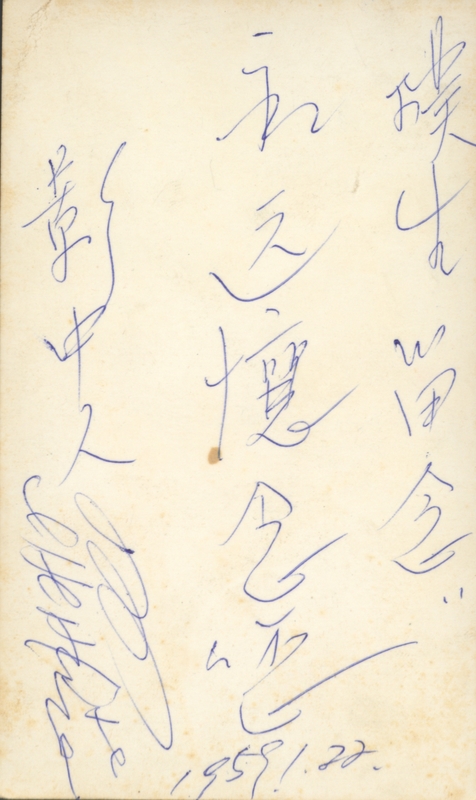 背面留言:樸生留念 永遠懷念您 1959.1.22 影中人 (草寫簽名)